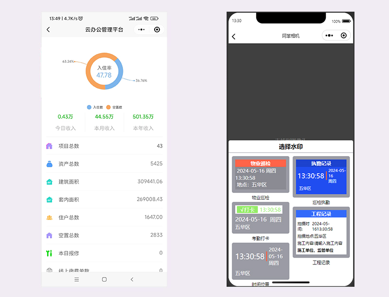 云辦公管理平臺(tái)主要有數(shù)據(jù)匯總、領(lǐng)導(dǎo)審批、資產(chǎn)圖表、資金圖表、收支流水賬、銀行日記賬、資產(chǎn)查詢(xún)、住戶(hù)查詢(xún)、到期合同、到期費(fèi)用、欠費(fèi)住戶(hù)、現(xiàn)場(chǎng)收費(fèi)、臨時(shí)收費(fèi)、人工抄表、設(shè)備巡查、空房巡查、報(bào)修工單、訪客登記、裝修工單、異常事項(xiàng)、跟進(jìn)管理、獎(jiǎng)懲登記、電子巡更等功能。